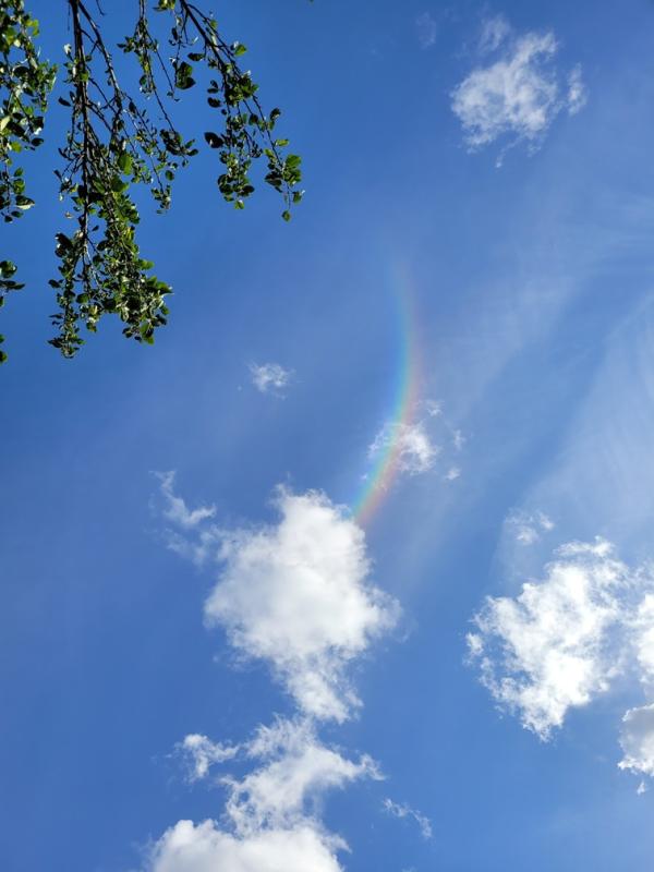 Wieder zurück auf dem Hof gab es dann noch eine Runde Pizza, bis wirklich alle damit versorgt waren. Dazu leckere Kuchen und Salate vom Mitbring-Büfett, außerdem Kaffee, natürlich vom Kaffee-Projekt mit der FEM in Nicaragua, sowie Tee. Und dann entdeckten wir noch einen ganz besonderen Regenbogen mitten am Himmel; wenn das kein gutes Zeichen für unsere Solawi ist :-)