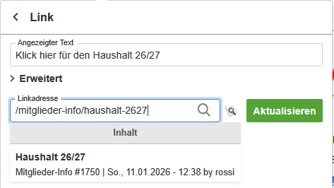 Statt nun die gesamte URL als Link zu verwenden, verwendest du nur den letzten Teil: '/mitglieder-info/haushalt-2627' (ACHTUNG: '/' nicht vergessen!.