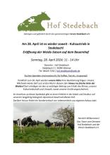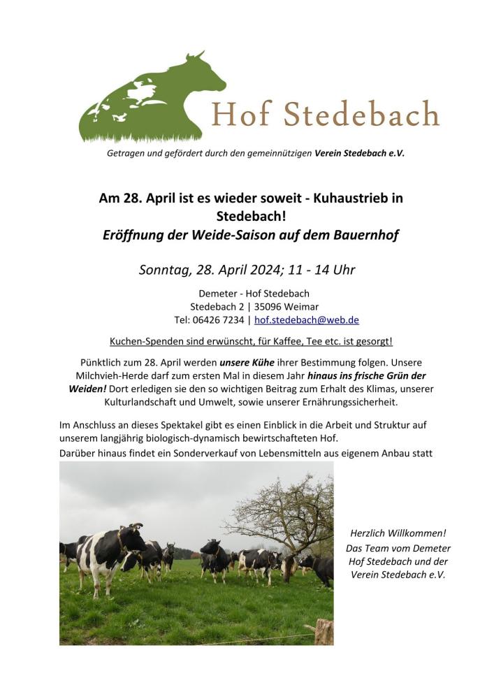 Pünktlich zum 28. April werden unsere Kühe ihrer Bestimmung folgen. Unsere Milchvieh-Herde darf zum ersten Mal in diesem Jahr hinaus ins frische Grün der Weiden! Dort erledigen sie den so wichtigen Beitrag zum Erhalt des Klimas, unserer Kulturlandschaft und Umwelt, sowie unserer Ernährungssicherheit. Im Anschluss an dieses Spektakel gibt es einen Einblick in die Arbeit und Struktur auf unserem langjährig biologisch-dynamisch bewirtschafteten Hof. Darüber hinaus findet ein Sonderverkauf von Lebensmitteln aus eigenem Anbau statt.