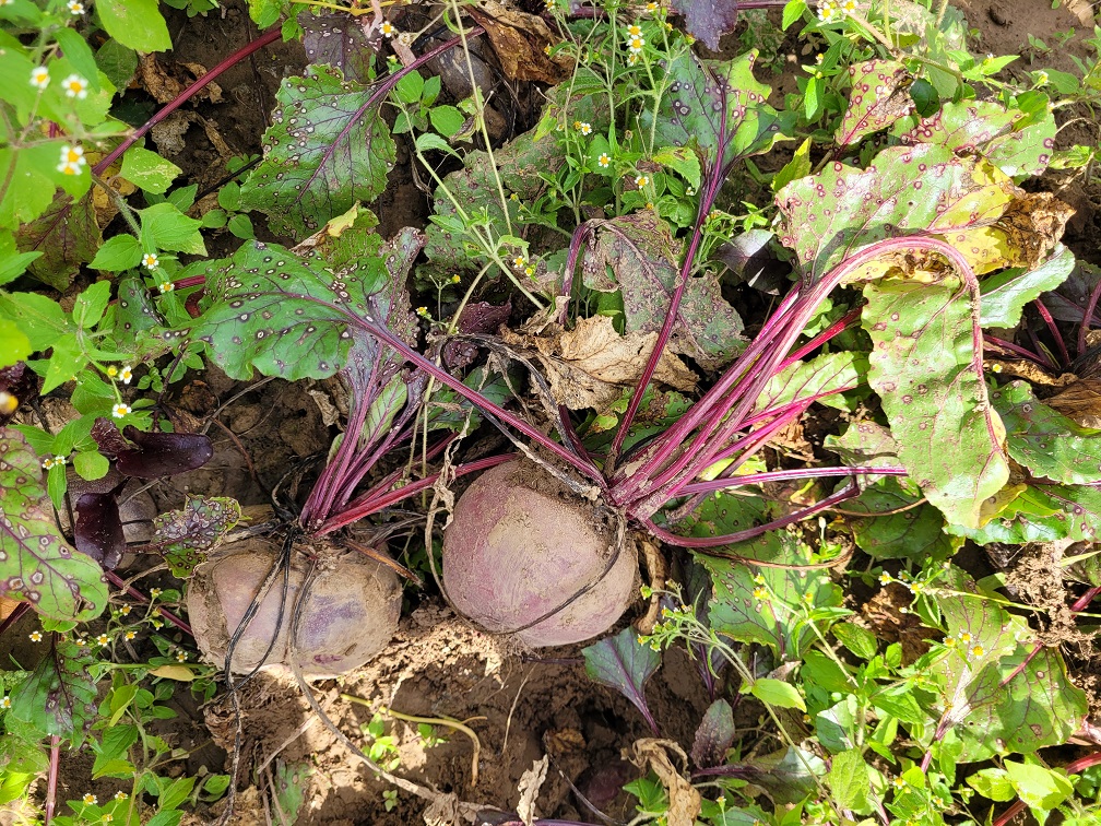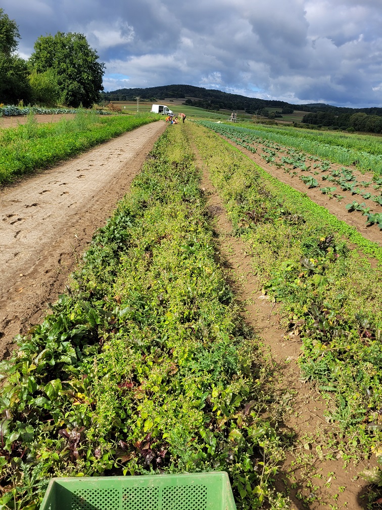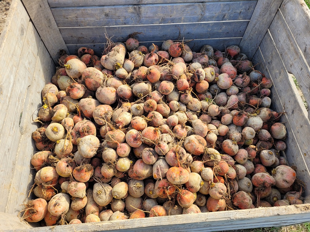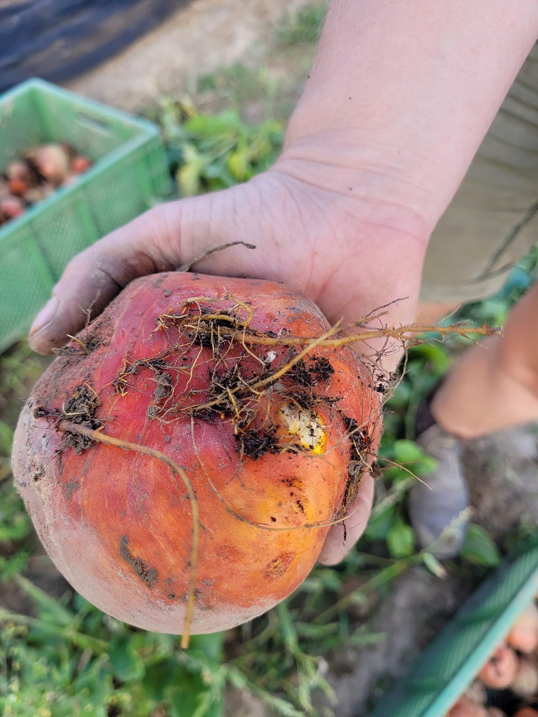 Am 30.8. haben insgesamt 9 Mitglieder 2 Großkisten Rote Bete und 1 halbe Großkiste Gelbe Bete geerntet - insgesamt fast 1,5 Tonnen! Dabei saßen die Beten so locker im Boden, dass man sie einfach rausziehen konnte, ein vorheriges Lockern mit dem Traktor war nicht nötig. Bloß ein bisschen matschig war es. Das sieht man auch an den Fußspuren im Nachbarbeet, die sich tief eingraben: