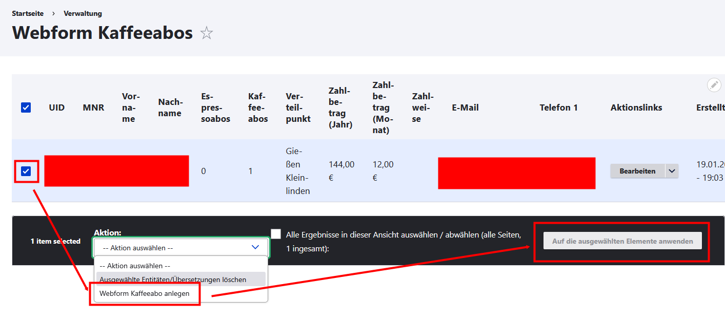 Hier zunächst die gewünschte Submission markieren, "Webform Kaffeeabo anlegen" auswählen und Klick auf "Auf die ausgewählten Elemente anwenden".